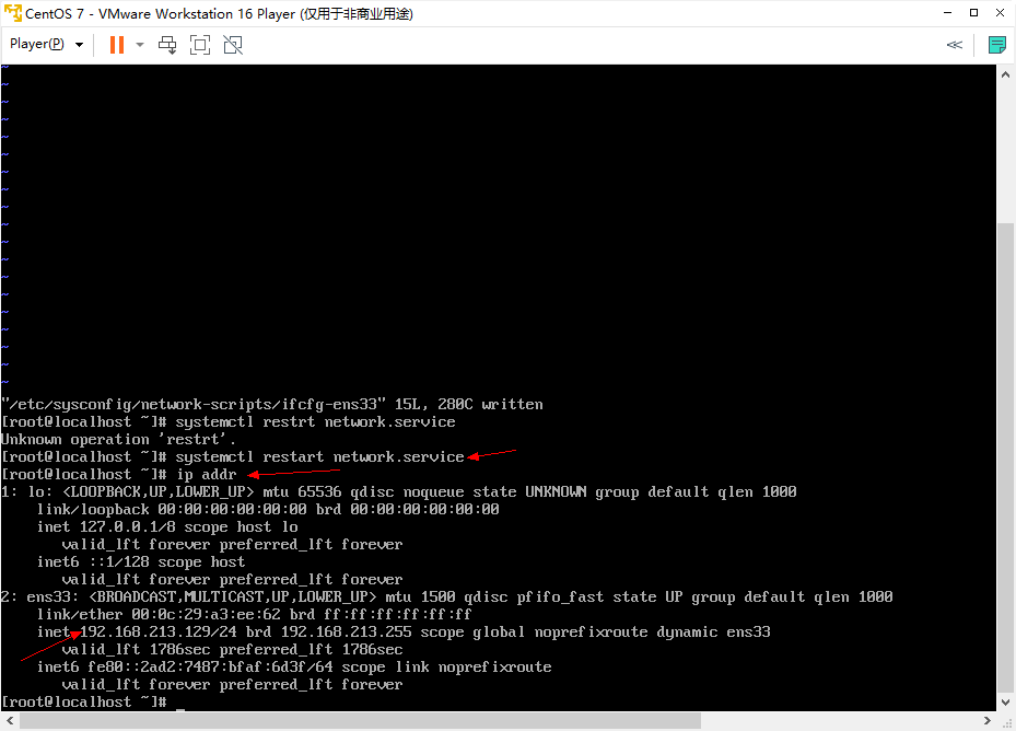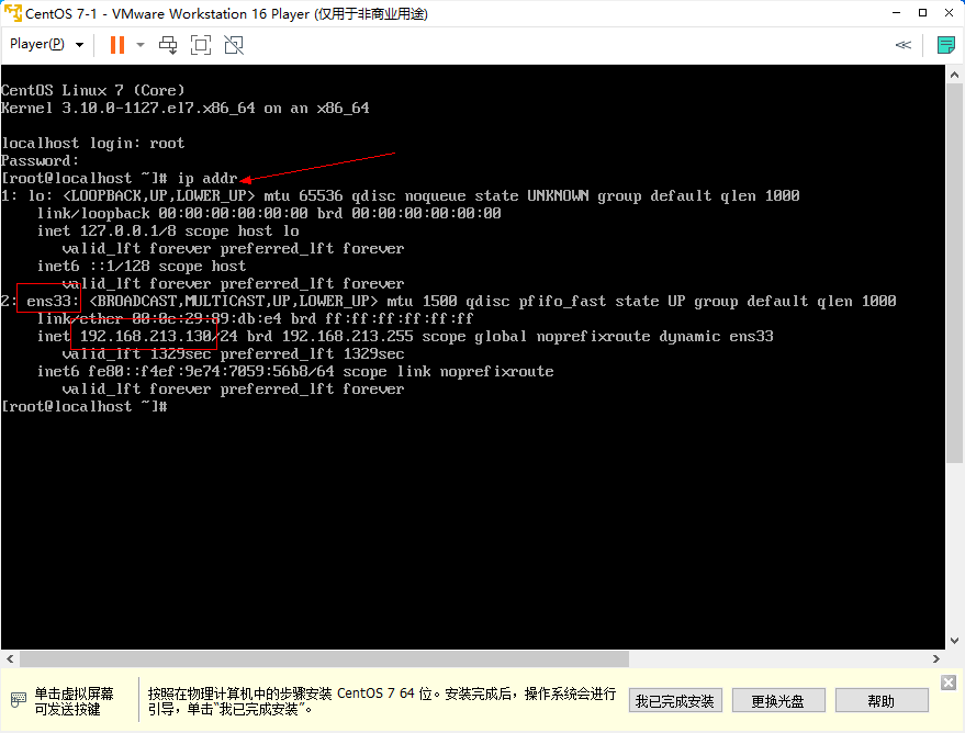 然后再次输入命令:ip addr 即可看到我们虚拟机的IP地址(两次编辑时间不同,所以此处的IP地址不同~)
