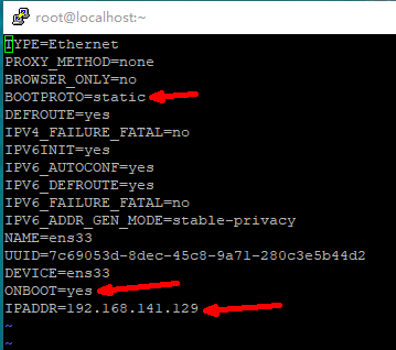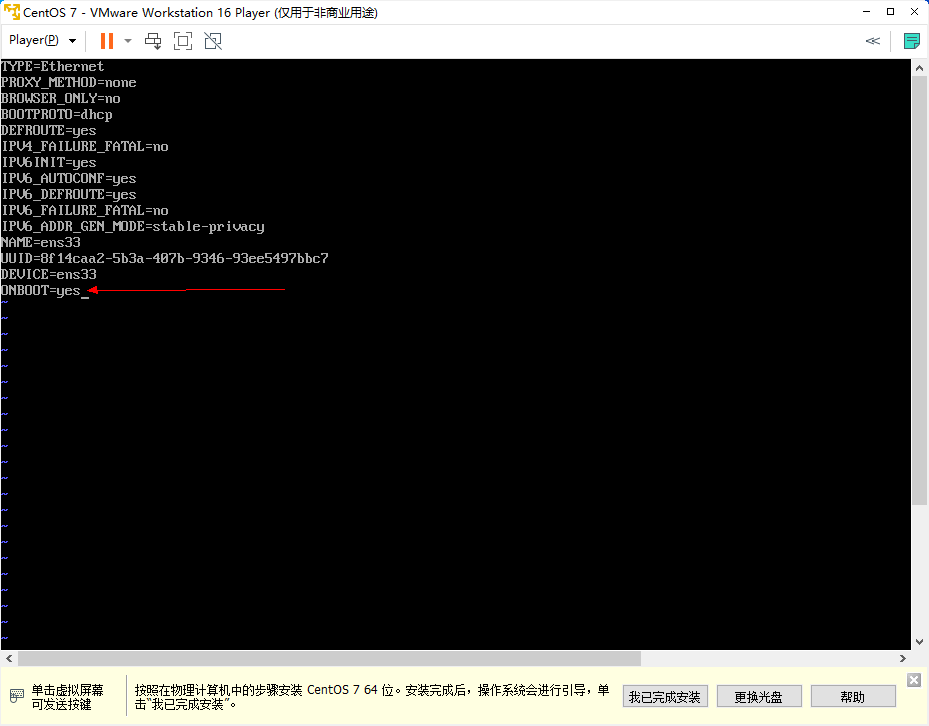 按 i 进入编辑模式,将ONBOOT=no改为ONBOOT=yes,就是开机启动