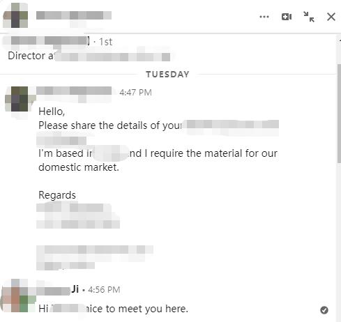 3)Dear Andy This is Grace from China, you can call me Grace, we areXXX manufacturer in China, noted you are also in XXX field, maybe we can supply something is just you need, Could you please kindly accept my invitation? Thanks in advance. Grace